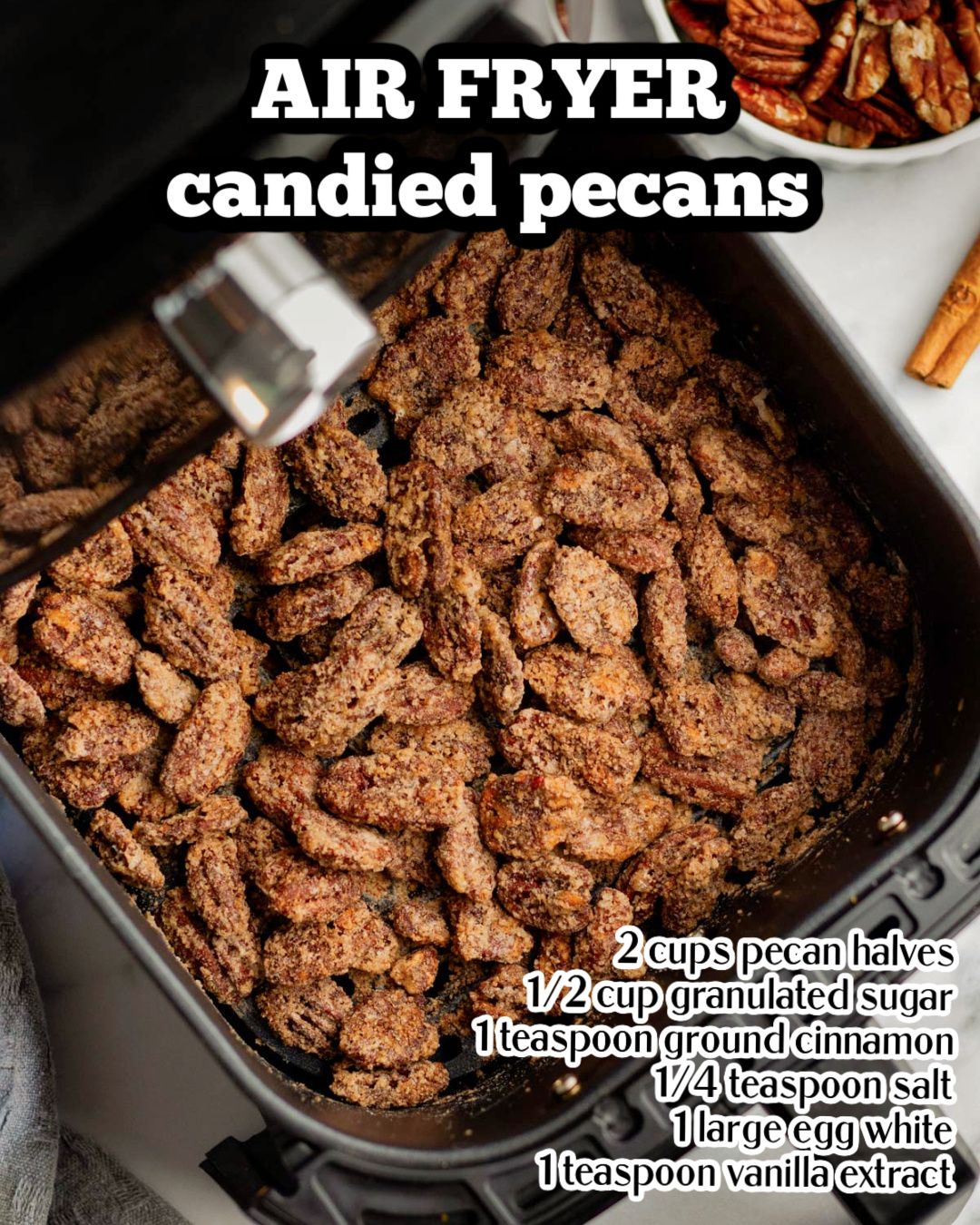 My Air Fryer Candied Pecans recipe is a classic that’ll have your kitchen smelling like the holidays with roasted pecans and warm cinnamon! These candied nuts are irresistible and perfect for gifting.