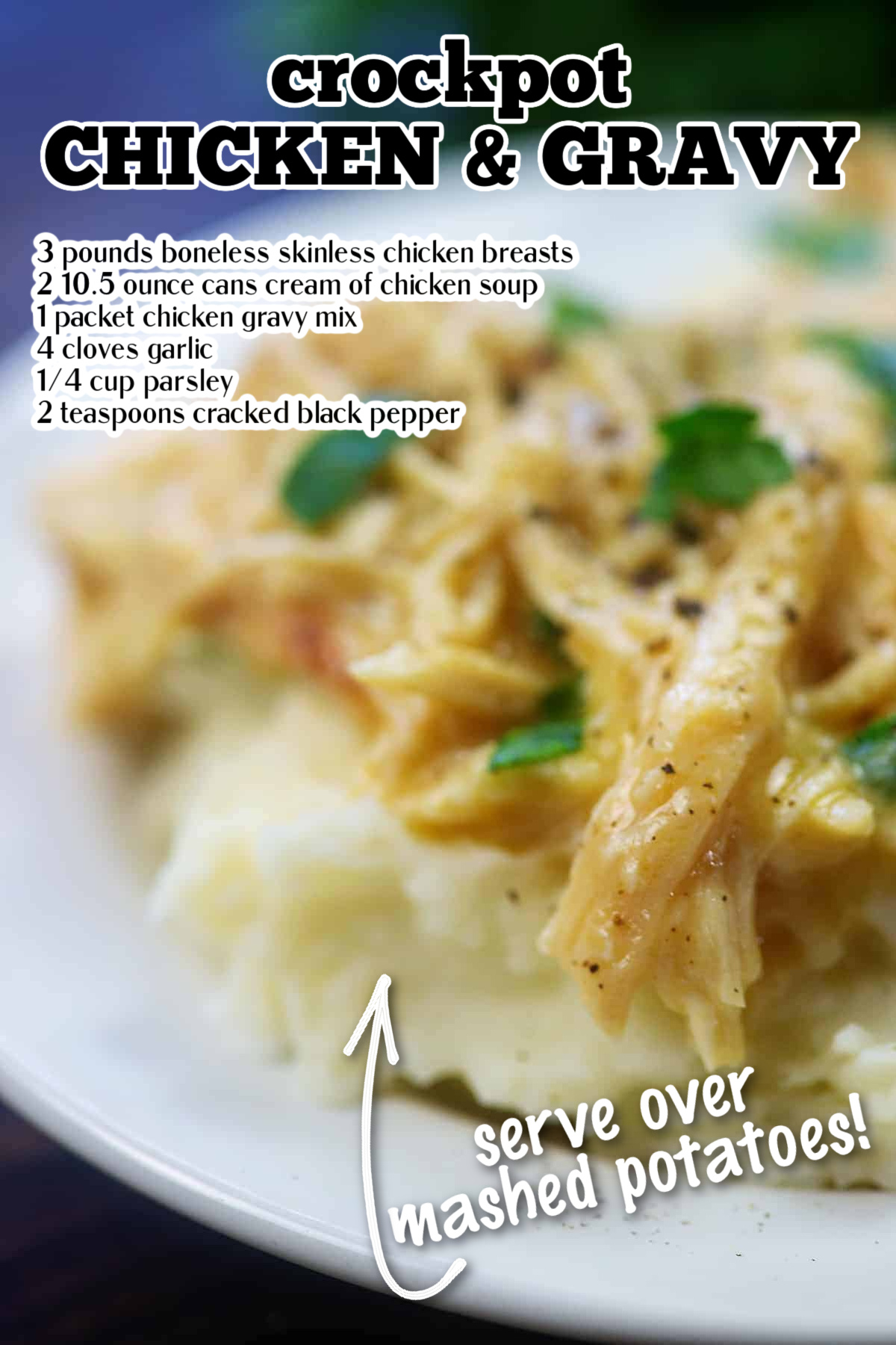 Crockpot chicken and gravy is a simple comfort food favorite in our house! Toss everything into your slow cooker and walk away. The gravy makes itself in the slow cooker and the chicken turns out so juicy and tender.