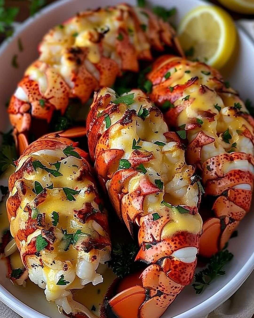 1.2. Using kitchen shears, cut the top shell of each lobster tail down the center, from the open end to the base of the tail. Pull apart the shell slightly and gently lift the meat to rest on top of the shell.