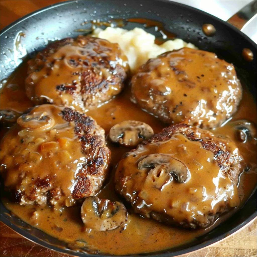 I recently read a Facebook post from Against All Grain about a Cream of Mushroom Soup recipe she loves to use in her green bean casserole for the holidays. This immediately got my brain going on the idea of making Salisbury Steak with it. I have always used the condensed version that comes in a can, but had to give that up (and happily so when I read the ingredients) once we converted to Paleo. That’s why I was so excited to try this out, because to me Salisbury Steak isn’t the same without the cream of mushroom soup gravy! I made the batch of soup the day before. the recipe makes enough for 2 meals like this. so you can freeze half of the soup if you’d like…or just eat it for lunch!