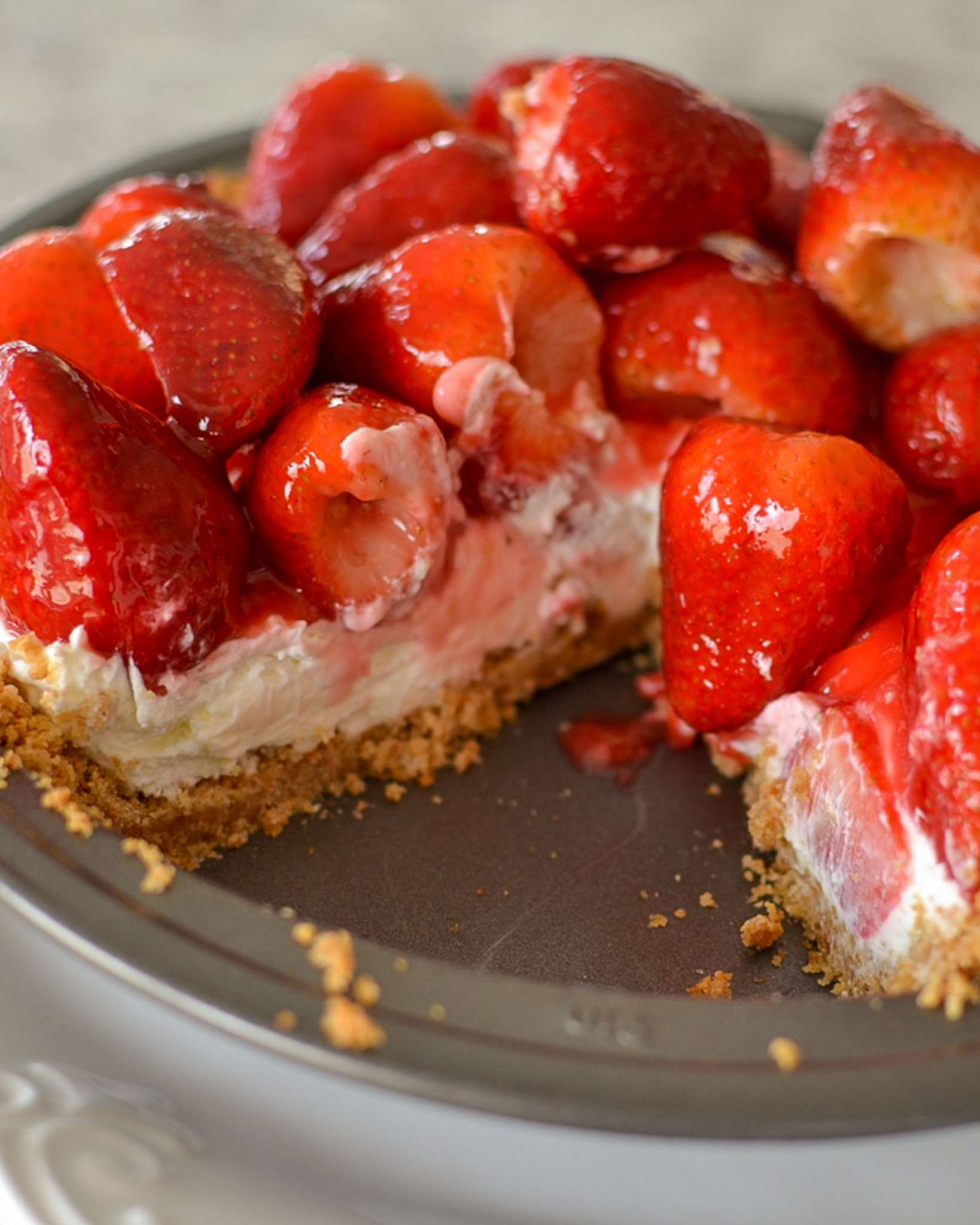 Strawberry Cheesecake Pie is a cinch to make. Are you super pinched for time? You can make the crust ahead of time and freeze it right in the pan, wrapped for up to 3 months. Then, thaw at room temperature before starting the recipe. You can also bake the pie crust and prepare the cream cheese filling several days in advance and store it wrapped in the refrigerator. However, hold off on the glazed strawberry topping until at least 12 hours before serving.